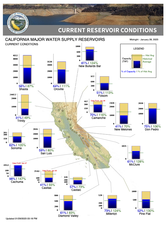 As you’ve in all probability heard, we’ve been getting plenty of rain in California lately, as weeks of atmospheric rivers hit the state in late December and early January. We’re okay right here – a little bit water within the storage within the nook that all the time will get a little bit water – nevertheless it’s been plenty of rain suddenly, and we’ve seen impacts each regionally and statewide. Regardless of some drizzle right now, the final week has been dry, cool, and clear, and it’s alternative to evaluate the place we’re and the place we’re going.
