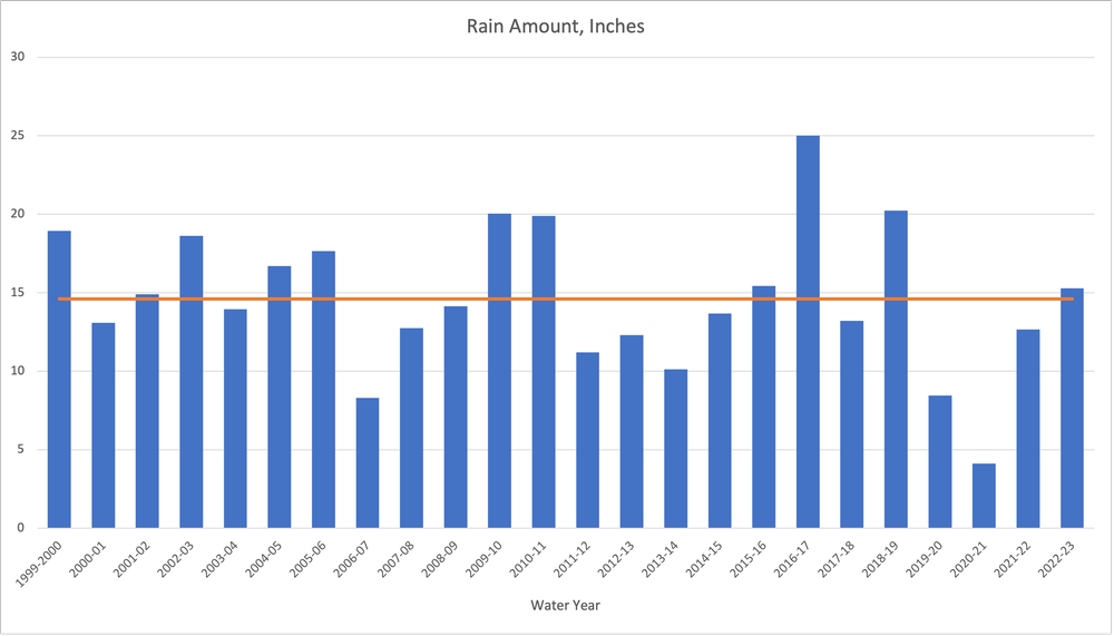 So the place are we traditionally with all this rain? Because of the climate station I bought us for our twentieth wedding ceremony anniversary (twentieth is climate station, proper?), we’ve bought a couple of 12 months’s price of native rainfall knowledge. The California Division of Water Sources defines our “water 12 months” as working October 1 – September thirtieth, and based mostly on our climate station, in simply 4 months of the 2022-23 water 12 months we’ve gotten over 20 inches of rain — greater than the 16 inches we bought in 2021-22, and almost tripled the 7.5 inches in 2020-21 complete. Right here’s a graph: