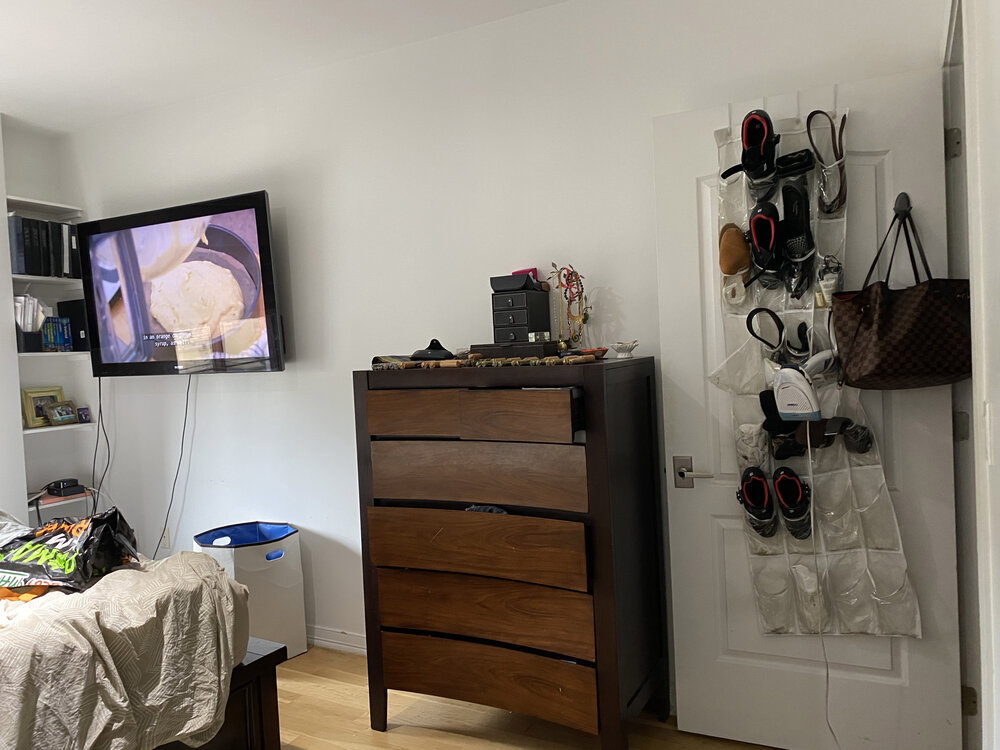 Sophia and Rana like to journey, and since they haven’t been in a position to vacay this 12 months, they wished their bed room to really feel like they had been on trip in some tropical wonderland. So I picked out this vivid, saffron tropical wallpaper to assist set that tone. I’m not gonna lie, this bed room is type of a sizzling mess. The matching furnishings set isn’t horrible however they’re not nice. The mattress body is method too cumbersome and when you might have a small area you need to maximize each inch. That headboard took up a couple of foot. And don’t even get began concerning the structure. Sophia has been sleeping with the doorways open going through the entrance door this whole time! And there’s no desk lamp both. I don’t wanna get into feng shui an excessive amount of however there may be an unsettling power if you’re sleeping so near the bed room door which additionally results in the entrance door. Proper?